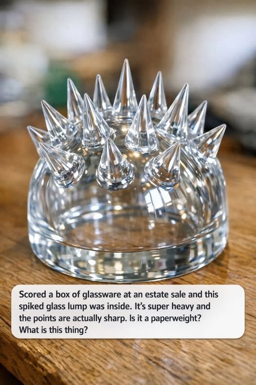 Scored a box of glassware at an estate sale and this spiked glass lump was inside. It’s super heavy and the points are actually sharp. Is it a paperweight? What is this thing?